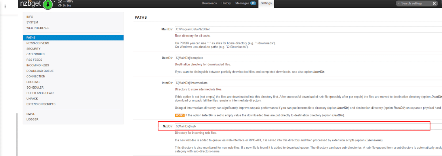 - Go to Settings > Paths > NZBDir